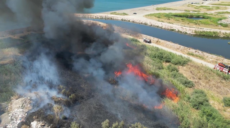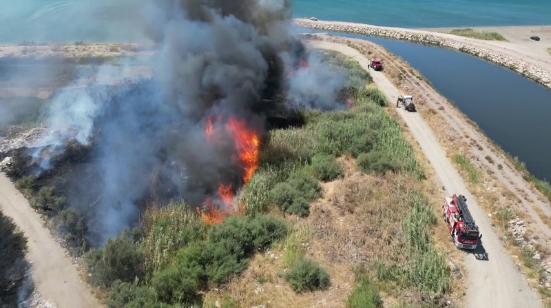 Altınkum Mahallesi Dalyan mevkiinde göçmen kuşların göç güzergahında bulunan denize yakın noktadaki sazlık alanda henüz belirlenemeyen bir nedenle 3 ayrı noktada yangın çıktı.