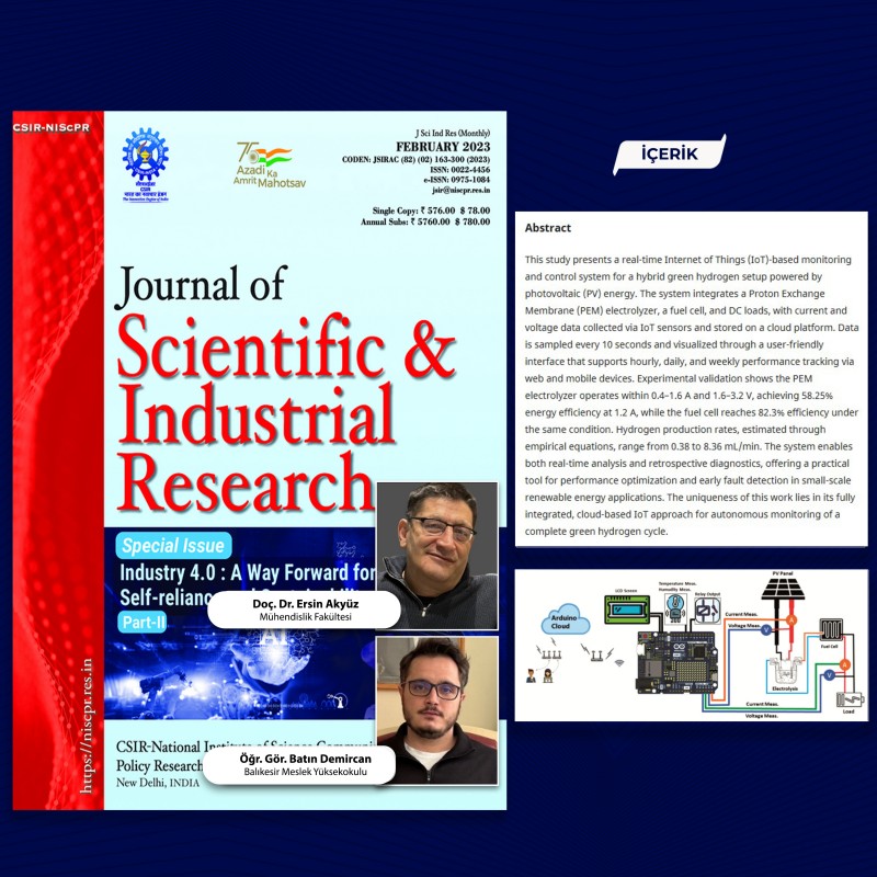 BAÜN akademisyenlerinden Doç. Dr. Ersin Akyüz’ün yanı sıra Balıkesir Meslek Yüksekokulu Elektronik ve Otomasyon Bölümü akademisyenlerinden Öğr. Gör. Batın Demircan ve Yüksek lisans öğrencisi Makine Yüksek Mühendisi İlker Çobanoğlu tarafından ortaya koyulan “Internet of Things and Cloud-Based Monitoring of an Electrolysis and Fuel Cell System” başlıklı çalışma, uluslararası dergi sıralamasının en üst dilimlerden olan Q3 ölçeğindeki "Journal of Scientific & Industrial Research" dergisinde yayımlandı.