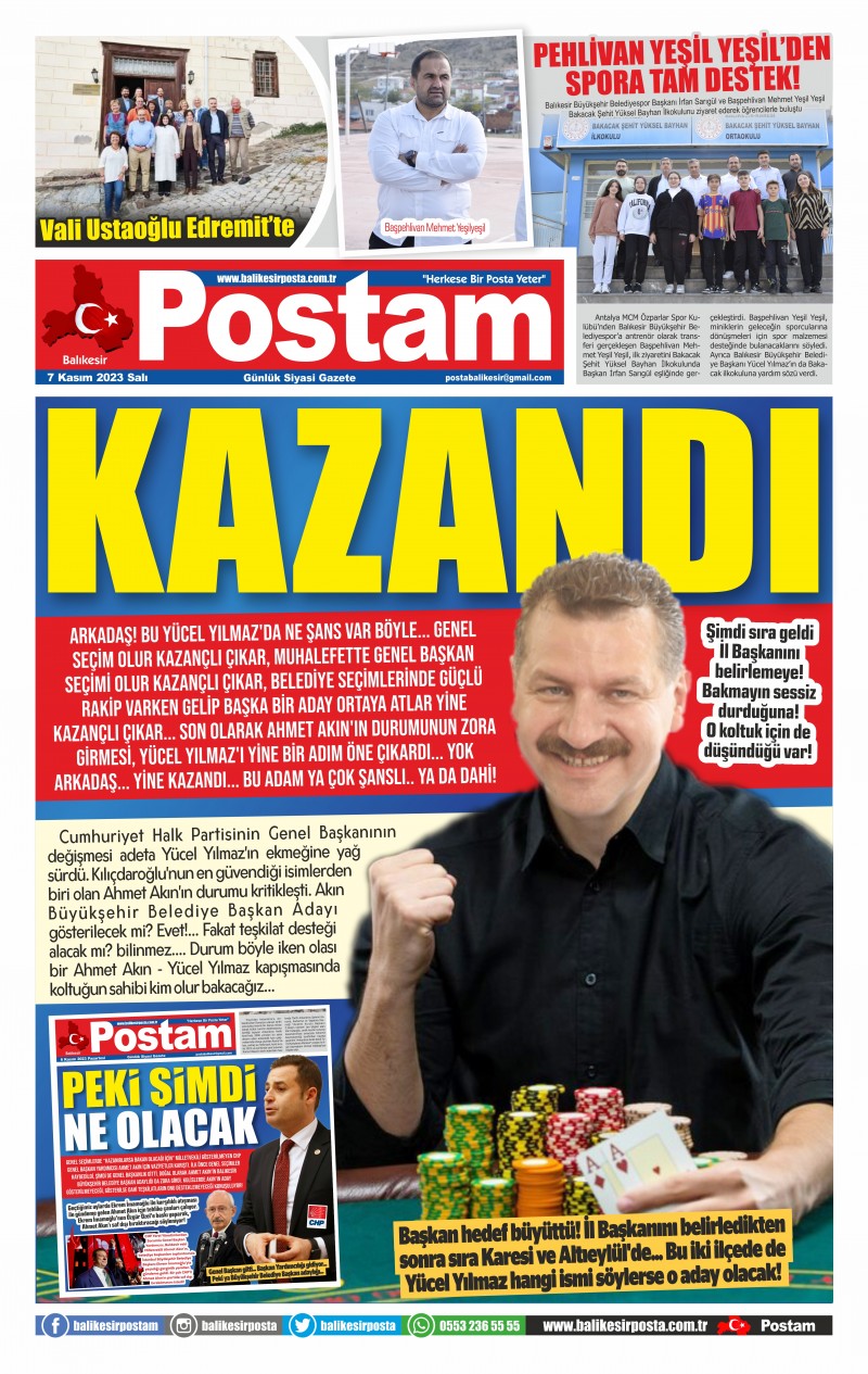 Arkadaş! Bu Yücel Yılmaz'da ne şans var böyle... Genel seçim olur kazançlı çıkar, muhalefette Genel Başkan seçimi olur kazançlı çıkar, Belediye seçimlerinde güçlü rakip varken gelip başka bir aday ortaya atlar yine kazançlı çıkar... Son olarak Ahmet Akın'ın durumunun zora girmesi, Yücel Yılmaz'ı yine bir adım öne çıkardı... Yok arkadaş... Yine kazandı... Bu adam ya çok şanslı.. Ya da dahi!