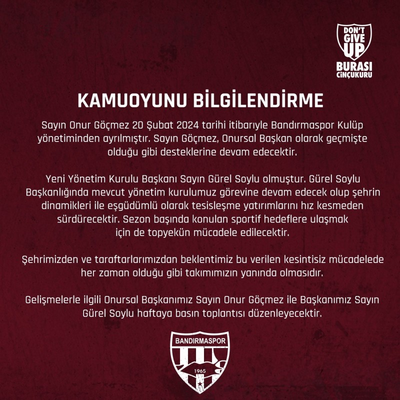 Bandırmaspor'un resmi sosyal medya hesapları üzerinden yapılan açıklamada, "Onur Göçmez, 20 Şubat 2024 tarihi itibariyle Bandırmaspor Kulüp yönetiminden ayrılmıştır. Göçmez, Onursal Başkan olarak geçmişte olduğu gibi desteklerine devam edecektir. Yeni Yönetim Kurulu Başkanı Sayın Gürel Soylu olmuştur. Gürel Soylu Başkanlığında mevcut yönetim kurulumuz görevine devam edecek olup şehrin dinamikleri ile eşgüdümlü olarak tesisleşme yatırımlarını hız kesmeden sürdürecektir. Sezon başında konulan sportif hedeflere ulaşmak için de topyekün mücadele edilecektir. Şehrimizden ve taraftarlarımızdan beklentimiz bu verilen kesintisiz mücadelede her zaman olduğu gibi takımımızın yanında olmasıdır. Gelişmelerle ilgili Onursal Başkanımız Onur Göçmez ile Başkanımız Sayın Gürel Soylu haftaya basın toplantısı düzenleyecektir" denildi.